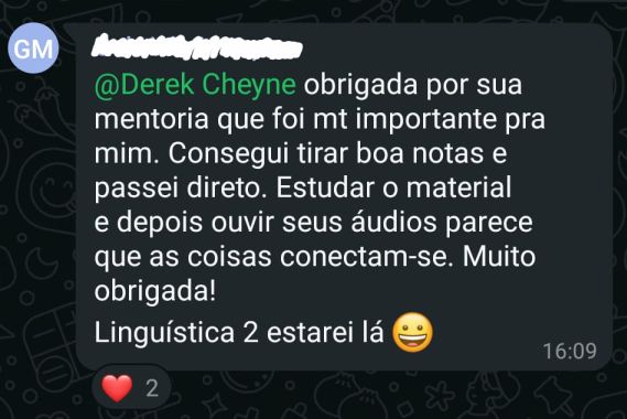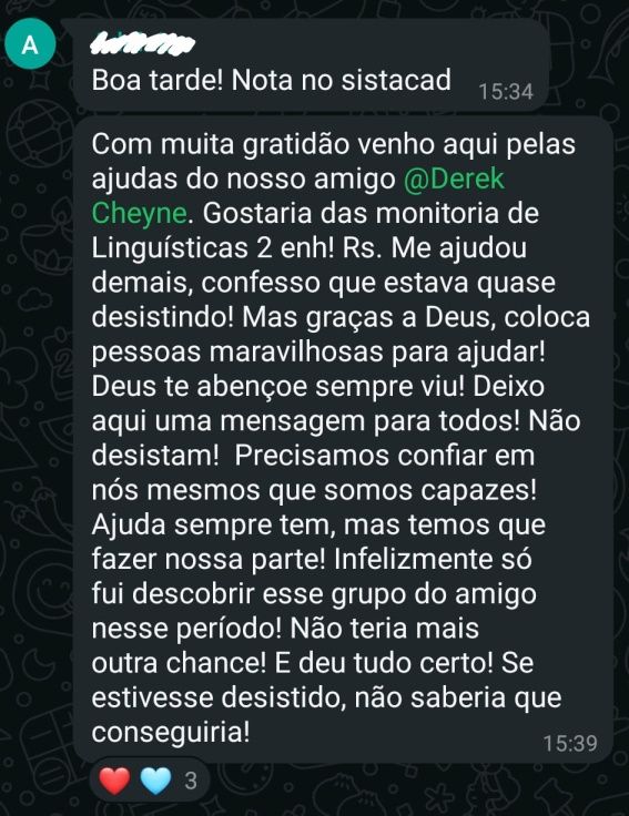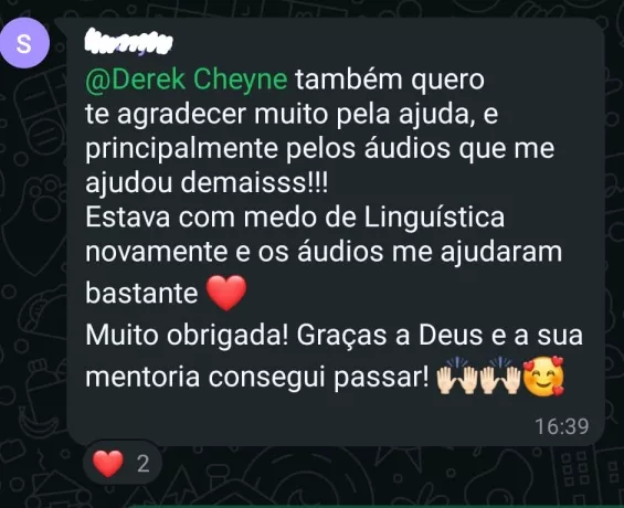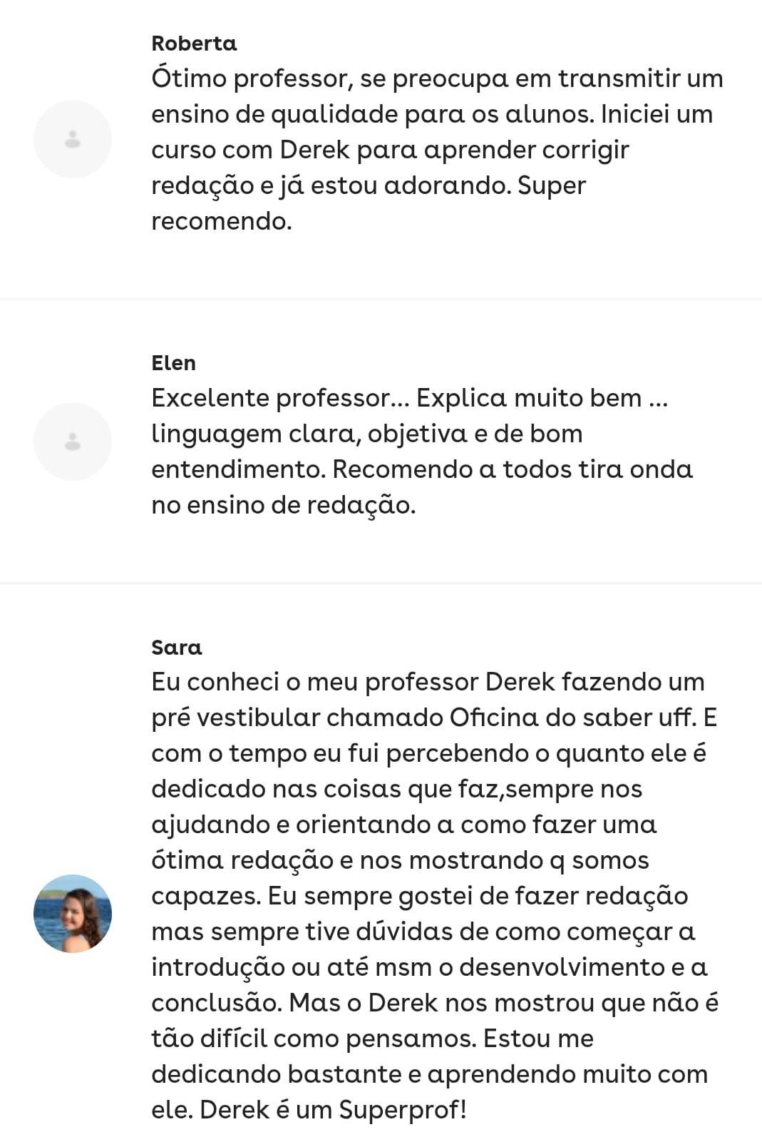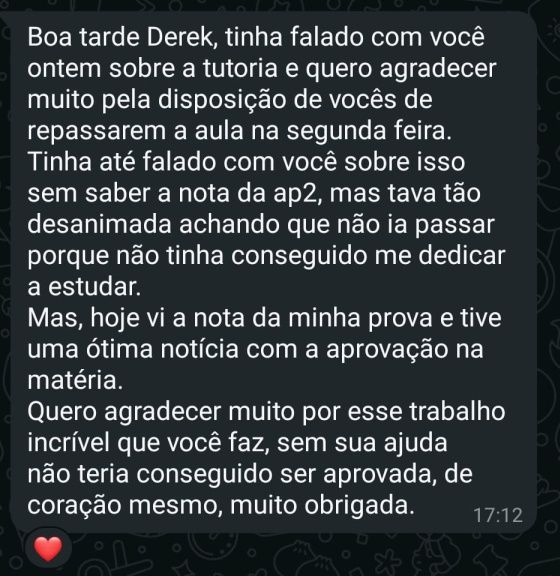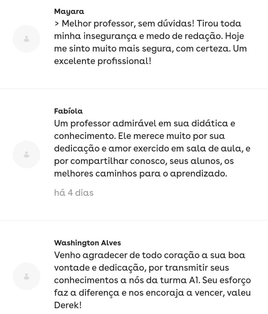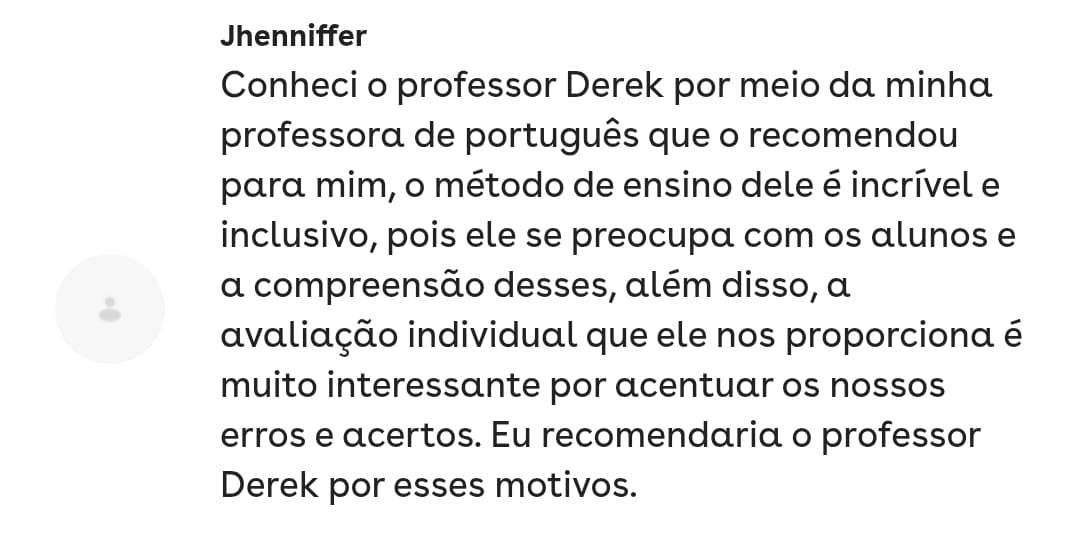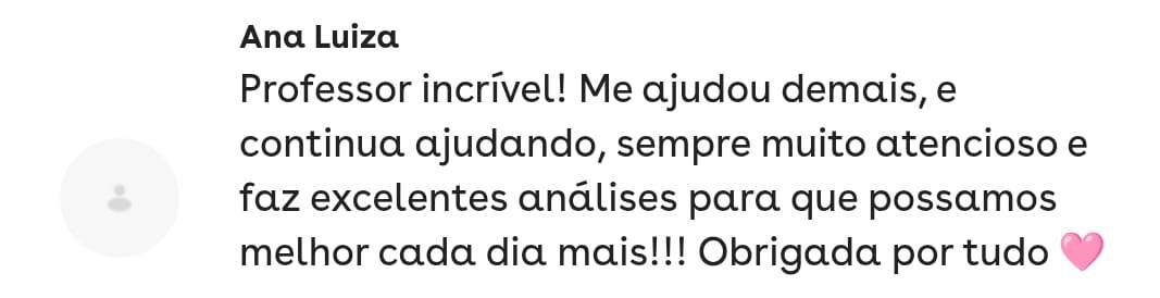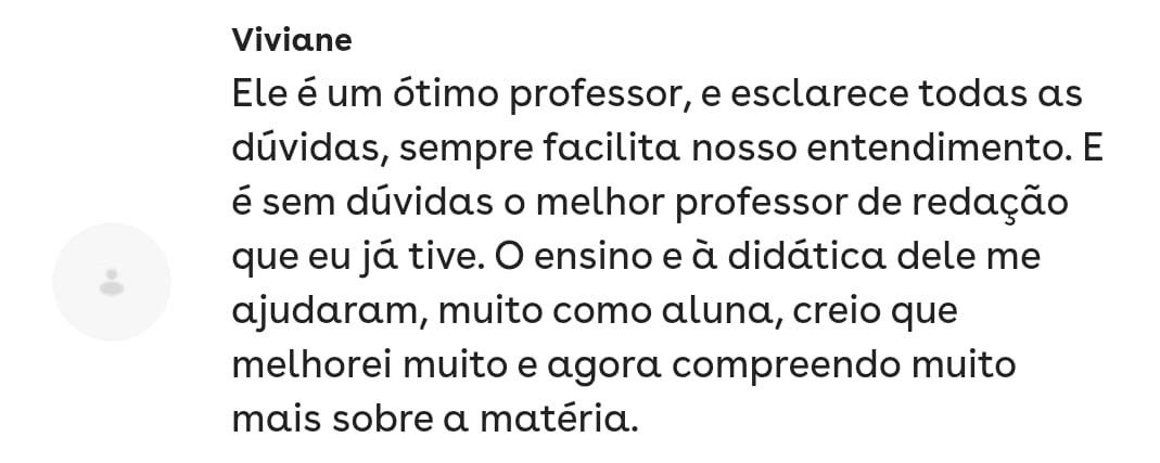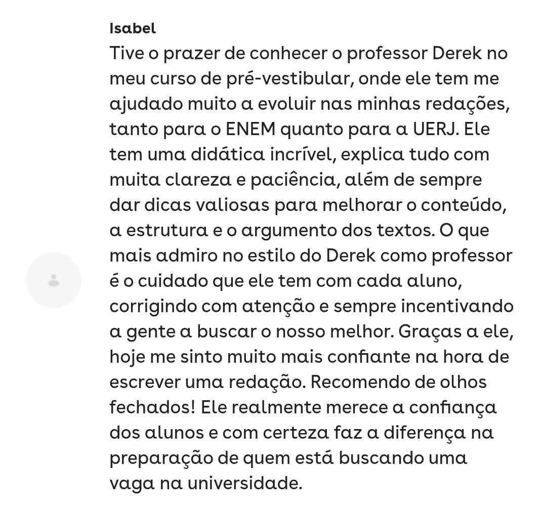 Essa é minha aluna de redação!! Fiquei super feliz por ela ter tirado 880 no Enem!Você tem interesse em trabalhar com correção de redação Enem? Sou o Derek, acadêmico em Letras pela UFF - Universidade Federal Fluminense, e bolsista pelo PROEX no pré-vestibular da mesma universidade, tendo cerca de 200 alunos por diversas turmas. Além das aulas que dou, tenho experiência com correção de redação em 5 plataformas que prestam serviço para diversas escolas privadas pelo Brasil. Eu quero te passar como fazer esse trabalho em minhas aulas. Ementa: competências, erros comuns, velocidade e qualidade de correção, plataformas.