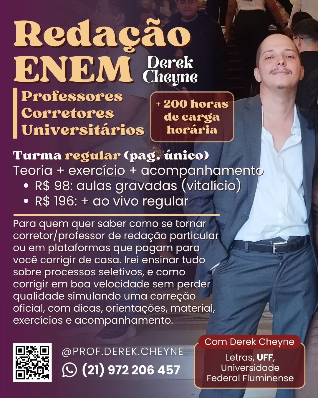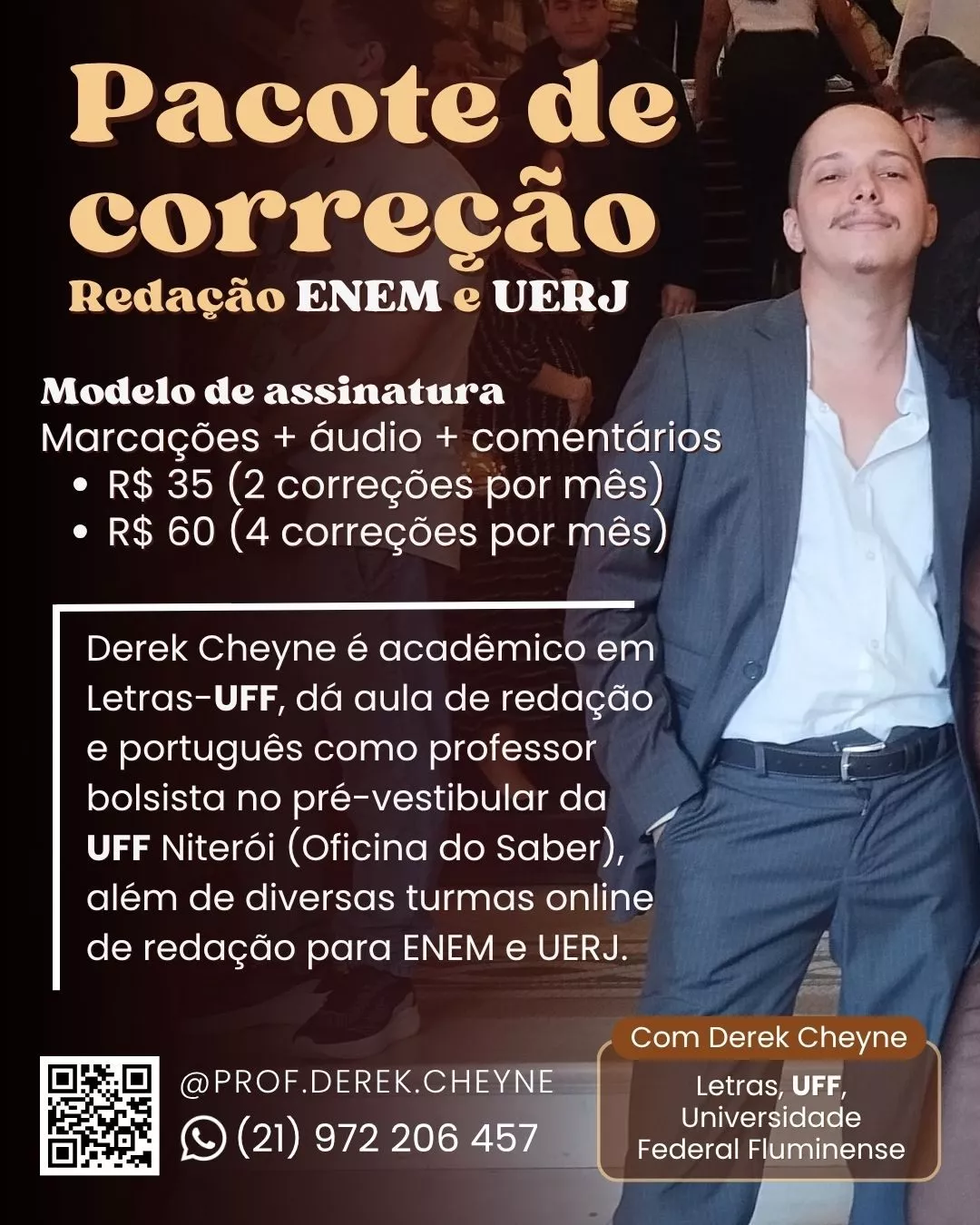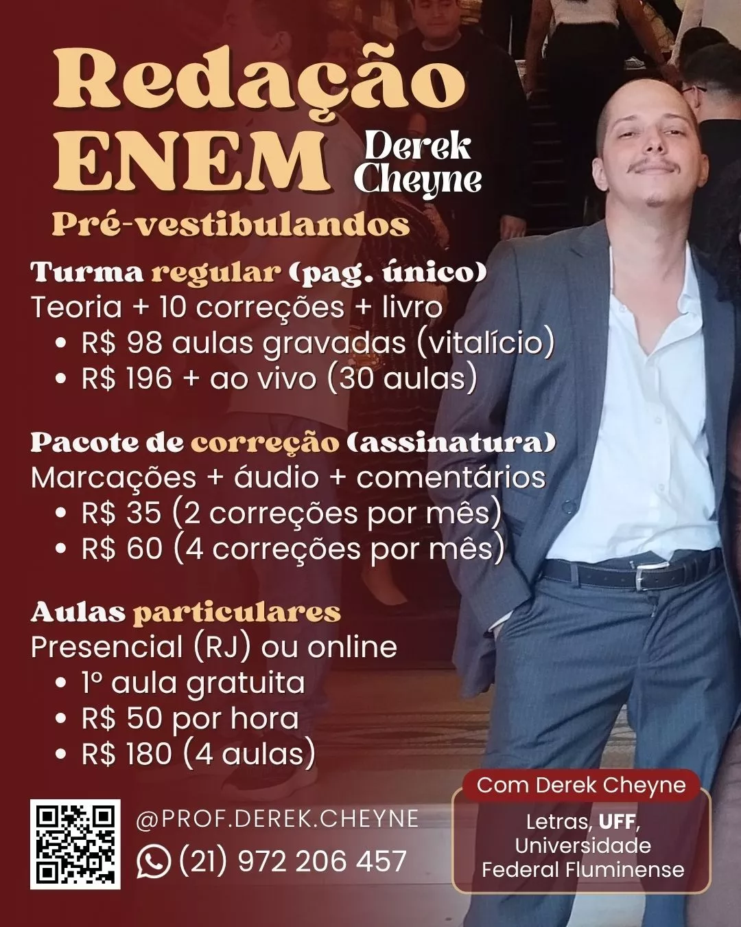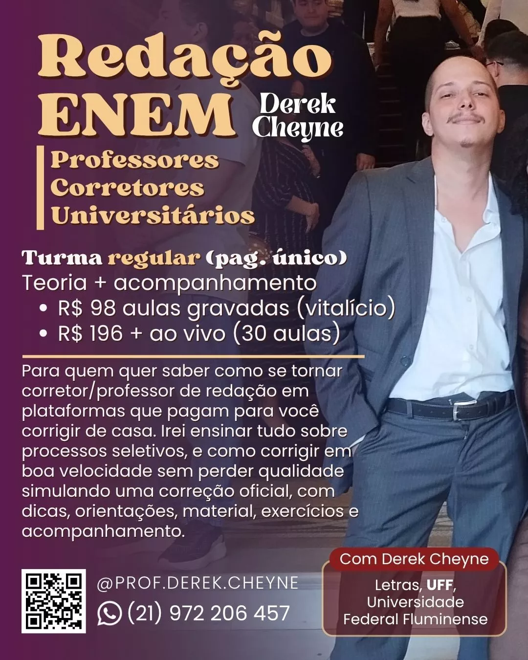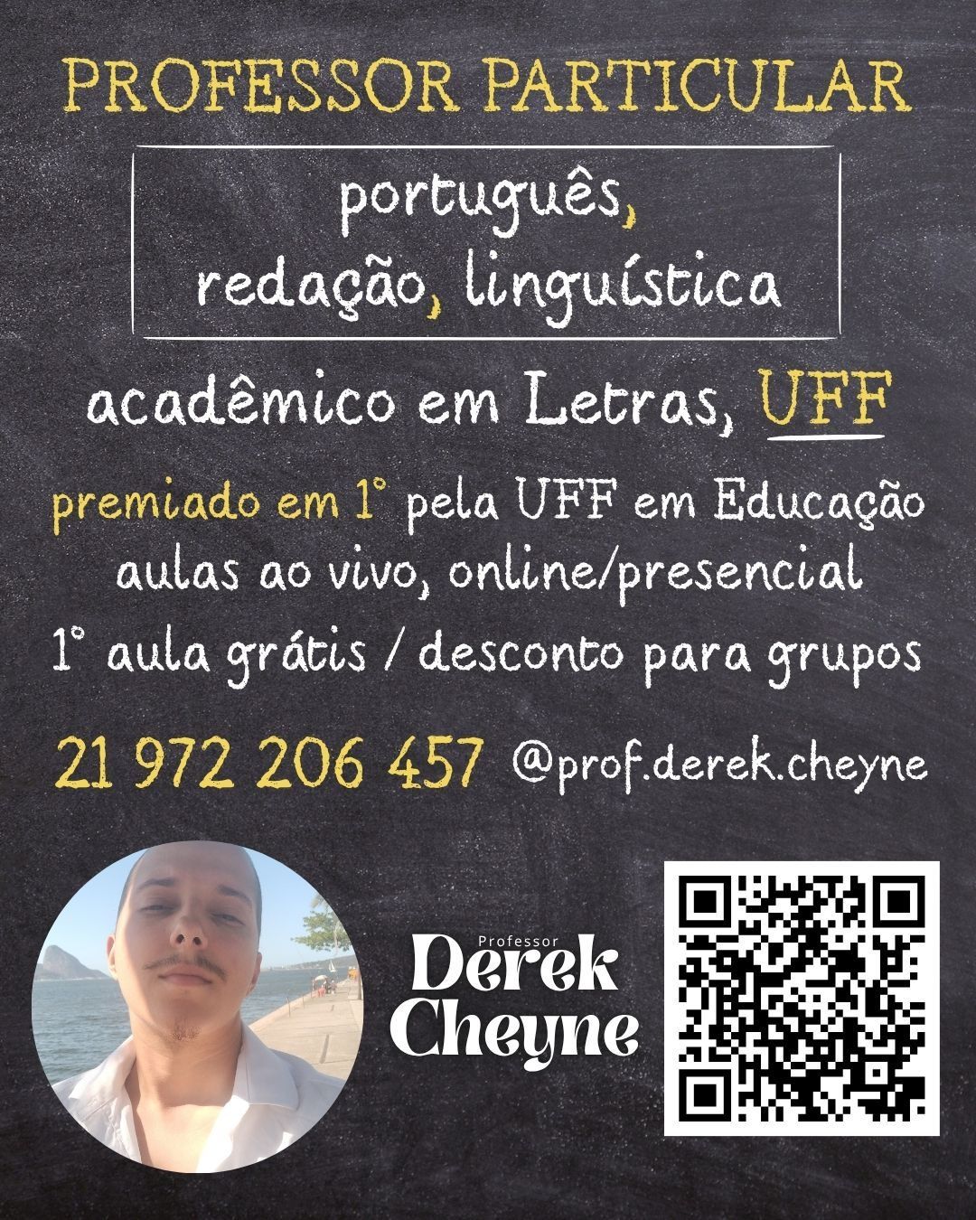Aperfeiçoe seus conhecimentos para melhorar na faculdade ou passar no vestibular, escrever com qualidade e ampliar seu horizonte acadêmico através de aulas ao vivo e gravadas. Com Derek Cheyne, acadêmico em Letras pela UFF - Universidade Federal Fluminense. Confira agora uma oferta mais quente que um dia de verão!