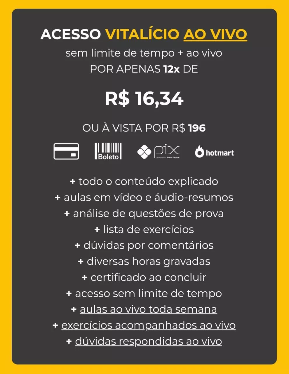 São aulas ao vivo (ficam gravadas) toda semana até o final do ano, e com acesso vitalício!! Pagamento único de 196 reais divididos em 30 aulas dá em todo de 6 reais por aula durante o ano todo! Super acessível, né? Podendo ainda parcelar em 12X.