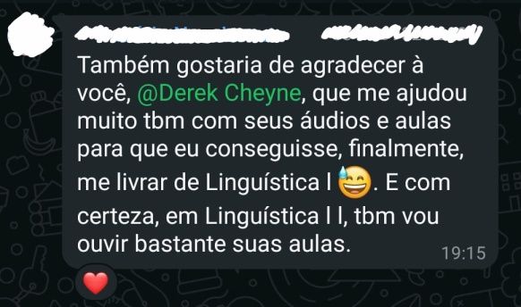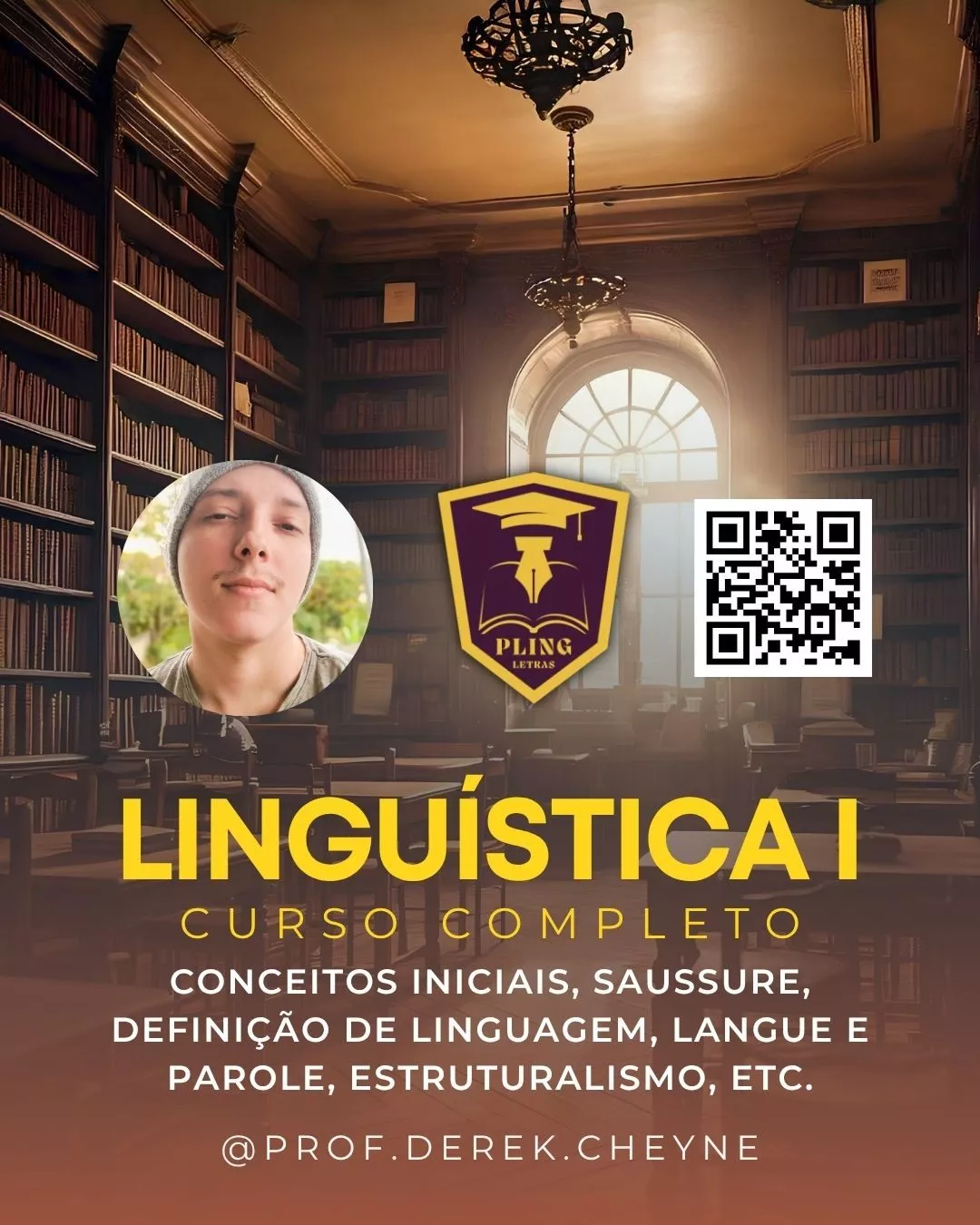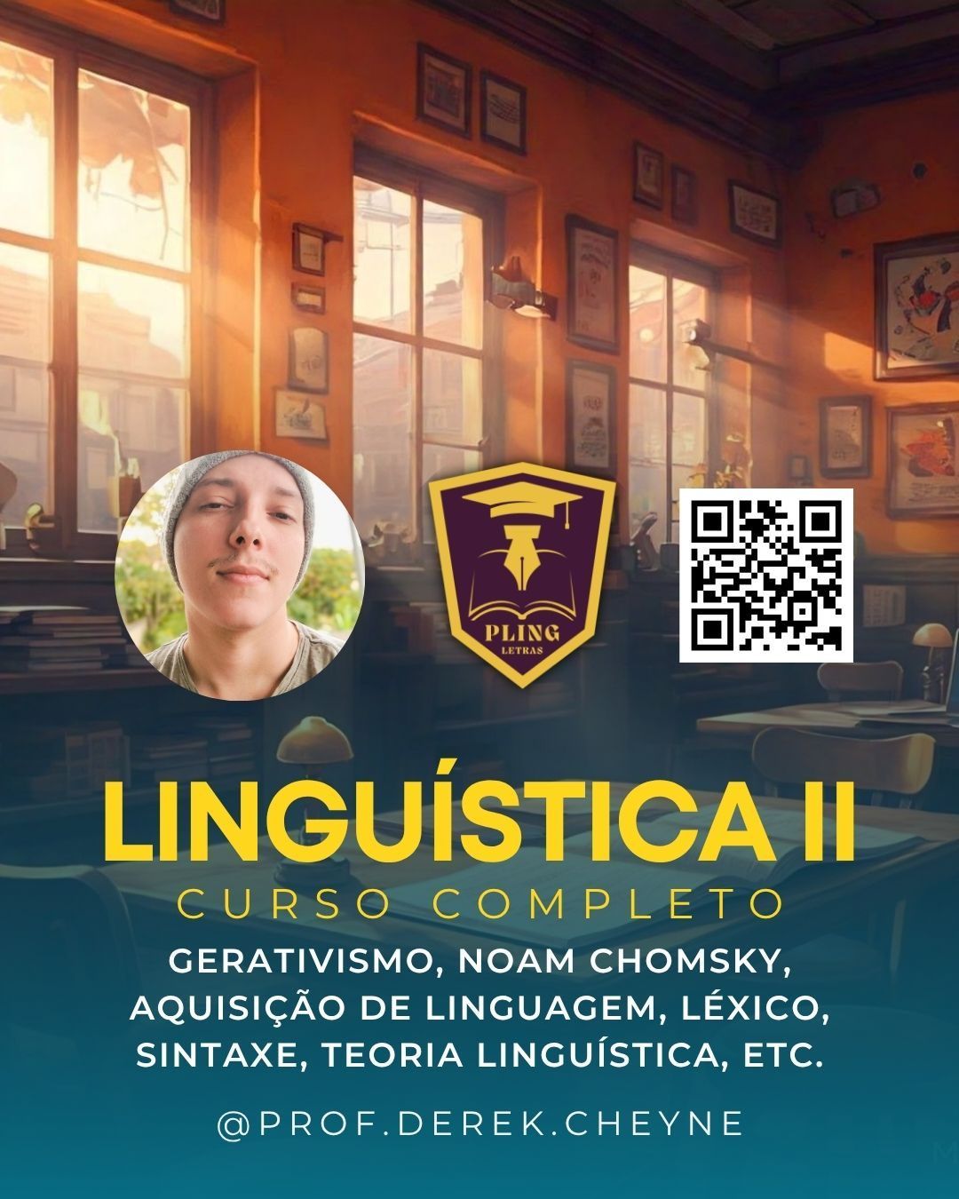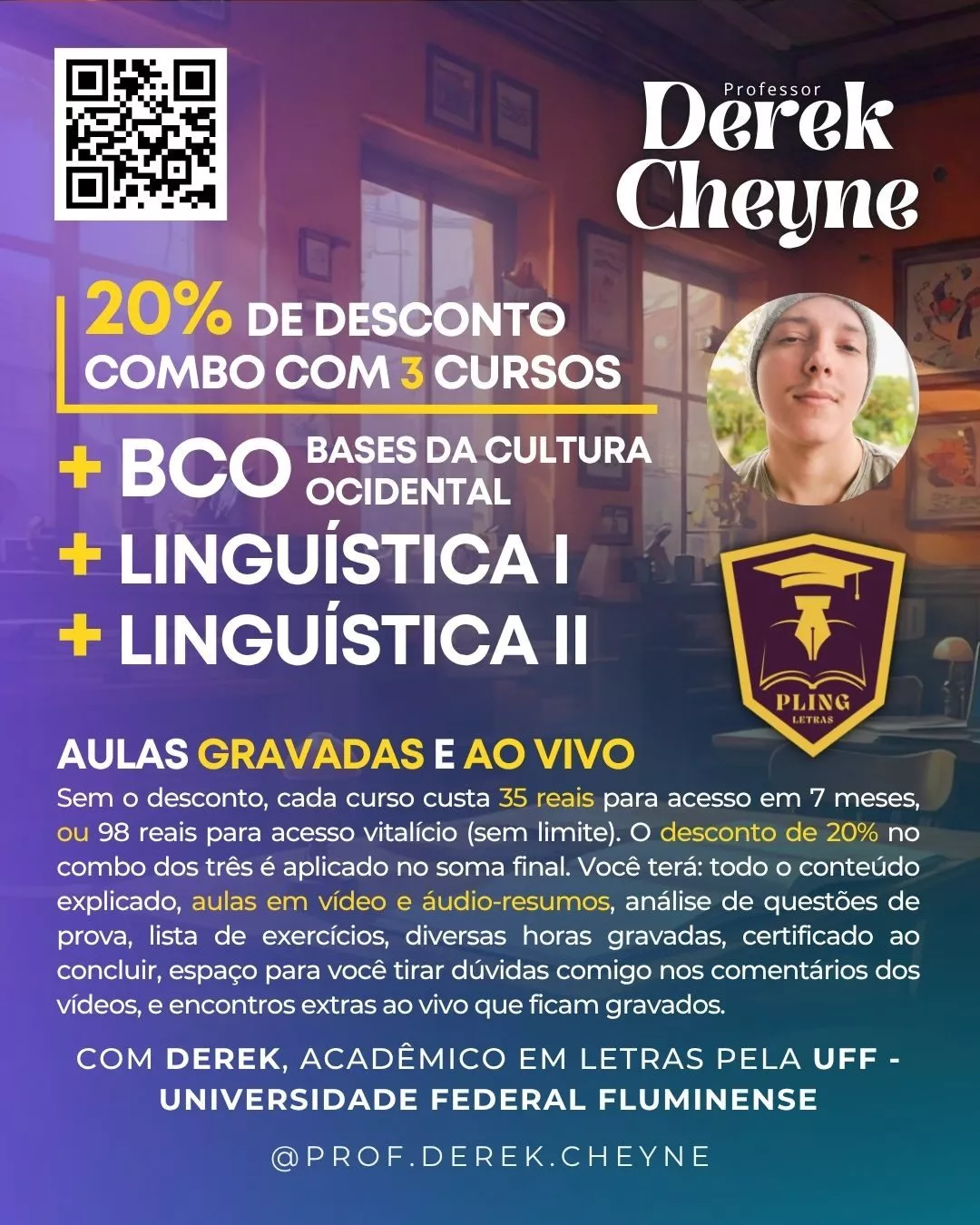 O acadêmico em Letras-UFF, Derek Cheyne, fez uma aula em grupo pelo PLING sobre a disciplina Linguística I da UFF. São 7 horas totais abrangendo todo o conteúdo da disciplina em vídeos e áudios como podcast gravados, além de orientações sobre questões de provas antigas, lista de exercícios e certificado de participação. O PLING - Portal Linguagem - é uma produtora de conteúdo para universitários e vestibulandos que aborda assuntos da área de Letras, tendo sido criado por Derek Cheyne, acadêmico em Letras-UFF.