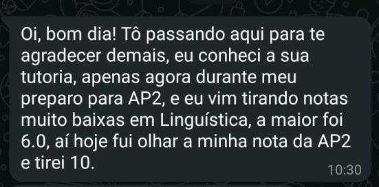 Além do serviço de correção, tenho uma turma de pré-vestibulandos que ensino tudo sobre como escrever uma boa redação para seu vestibular, com teoria, exercícios, dicas, orientações, material, acompanhamento e correção de seus textos.