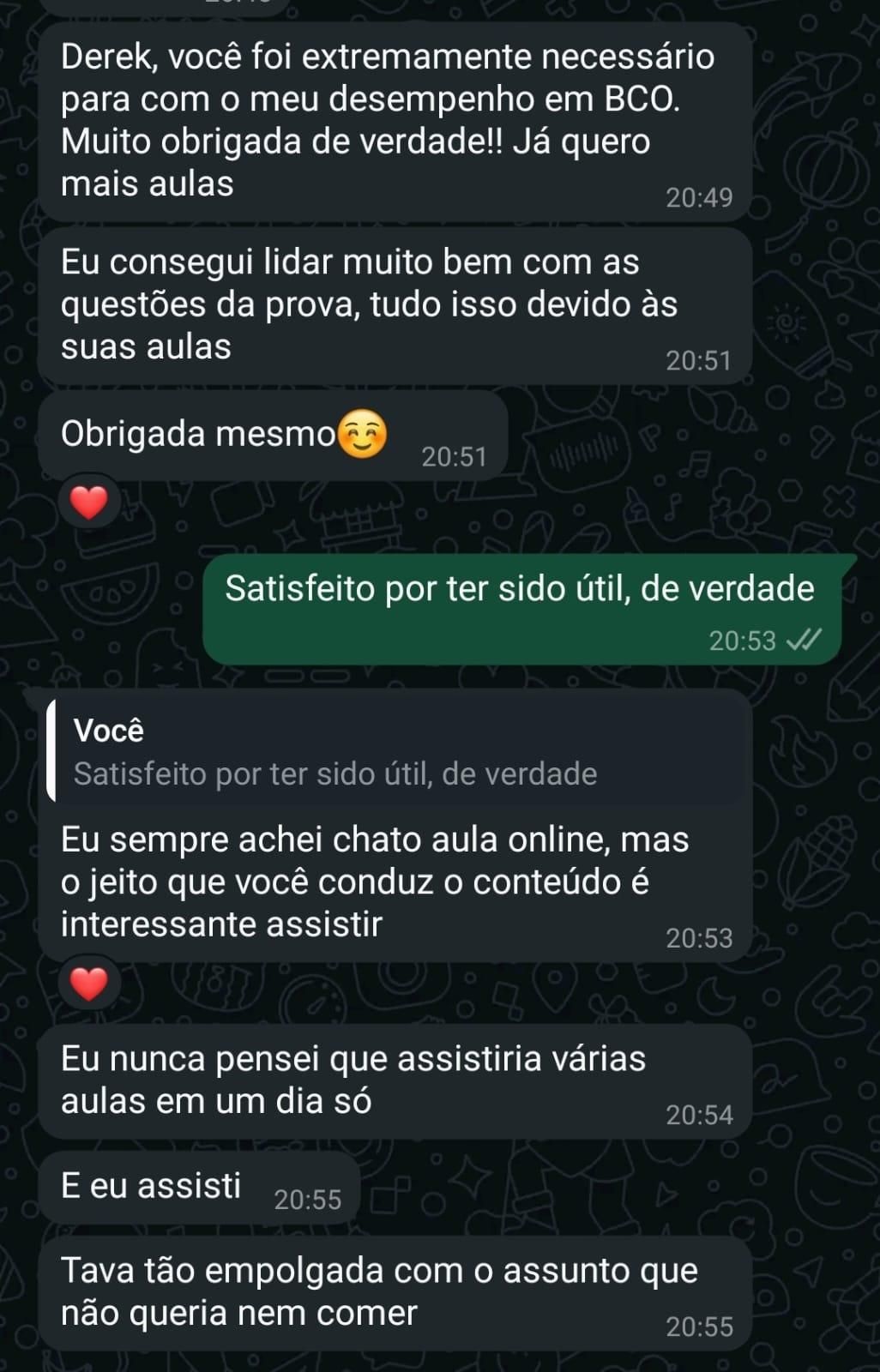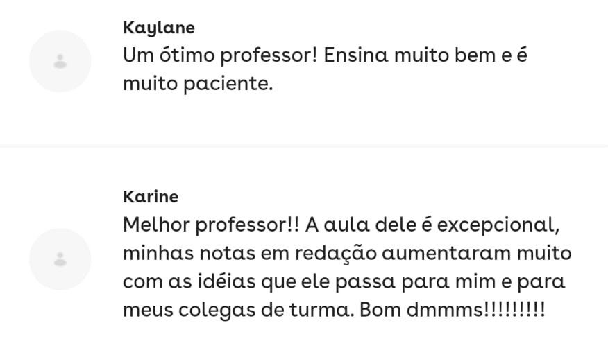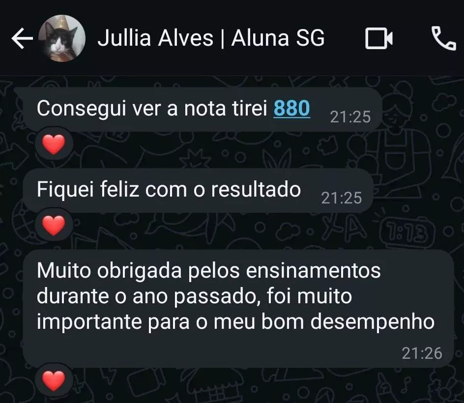 Essa é uma das minhas alunas de redação!! Fiquei super feliz por ela ter tirado 880 no Enem! Quer estudar comigo também? Sou o Derek, acadêmico em Letras pela UFF - Universidade Federal Fluminense, e bolsista pelo PROEX no pré-vestibular da mesma universidade, tendo cerca de 200 alunos por diversas turmas. Além das aulas que dou, tenho experiência com correção de redação em 5 plataformas que prestam serviço para diversas escolas privadas pelo Brasil. Quero ser seu professor!Ementa: exigências do Enem, exercícios de produção textual, argumentos, competências, temas etc.