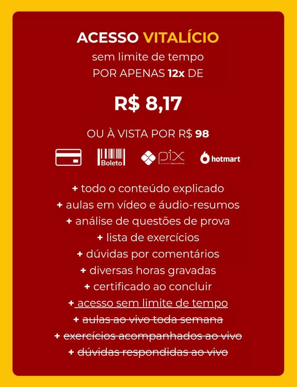 Você terá: todo o conteúdo explicado, aulas em vídeo e áudio-resumos, análise de questões de prova, lista de exercícios, diversas horas gravadas, certificado ao concluir, espaço para você tirar dúvidas comigo nos comentários dos vídeos, e encontros extras ao vivo que ficam gravados.